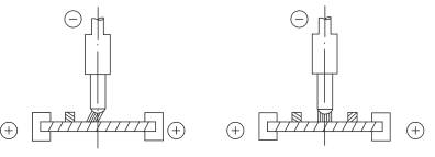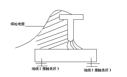 接地端在生產(chǎn)過程中總是預(yù)先接好,在焊接過程中,由于工件慢慢被磁化,將發(fā)生電弧向接入端的另一面偏移。此時(shí)應(yīng)盡早接入另一根規(guī)格相同的地線,長(zhǎng)度相同,以防止工件被磁化而發(fā)生磁偏吹。如下圖2-1所示: